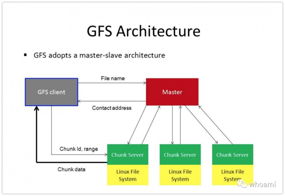 GFS分布式文件系统,并非标准的Posix标准实现,GFS主要提供快照和记录追加操作,多路结果合并。