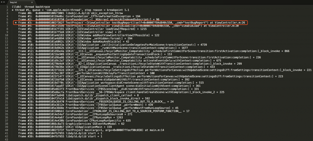 但有些时候我们手头可能有其它的活不能立即进行排查,或者崩溃的是其他同事的代码,需要先把控制台的崩溃日志复制粘贴到其他地方保存起来,过后再看或者告知同事进行解决。强大的 LLDB 调试工具提供了一个 bugreport 命令帮我们快速完成导出日志这件事。