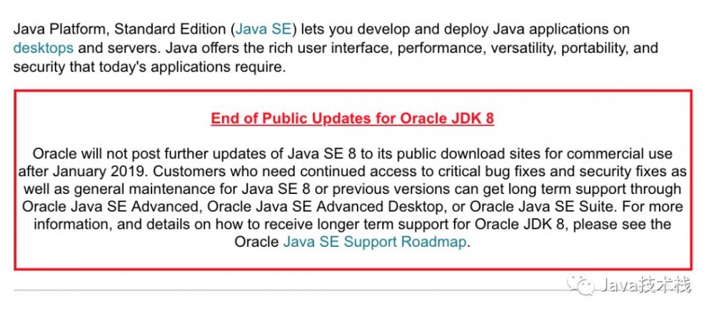 2019年1月之后,Oracle将不会在其网站上发布Java SE 8商业使用的进一步更新下载。那些需要持续获取安全的bug修复和安全补丁以及Java SE 8或以前版本的稳定性支持可以通过Oracle Java SE高级版,Oracle Java SE高级桌面,或Oracle Java SE套件。有关更多信息以及如何获得Oracle JDK 8长期支持的详细信息,请参阅Oracle支持路线图。