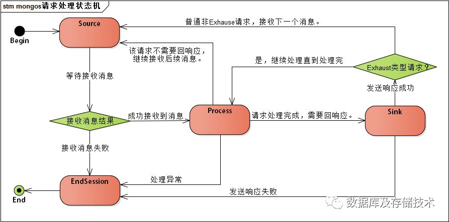 TransportLayer接收到新连接后,会创建专门的conn线程负责处理该连接的后续所有请求,具体逻辑在ServiceEntryPointMongos类的_sessionloop函数中,根据请求的类型循环“收包,处理,回响应 ” 三个步骤,总结状态机转换关系如下: