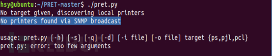 当没有参数直接运行./pret.py时,pret会自动通过SNMP协议寻找可能的打印机。