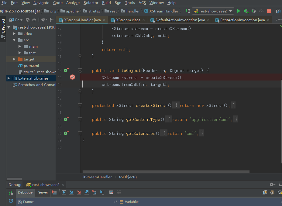 在toObject()处下一个断点,进行调试,发现其上层调用栈中,ContentTypeInterceptor类会根据请求的Content-Type选择对应的Handler进行处理。并且struts2-rest-plugin-2.5.12.jar的struts-plugin.xml配置文件是当Content-Type为xml会调用XStreamHandler类进行处理
