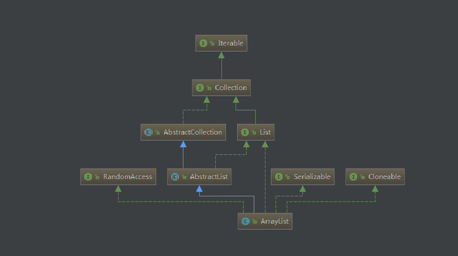 从图中可以看出ArrayList类继承了AbstractList类,实现了List、RandomAccess、Serialzable、Cloneable接口