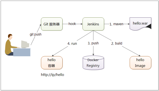 本案例中假设代码托管在git.oschina.com上,Jenkins和Docker Registry(类似于yum源)各运行在一个Docker容器中。JAVA项目自己也单独运行在一个叫hello的容器中。