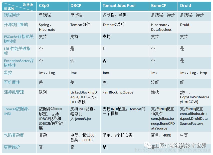 C3p0: 开源的JDBC连接池,实现了数据源和JNDI绑定,支持JDBC3规范和JDBC2的标准扩展。目前使用它的开源项目有Hibernate、Spring等。单线程,性能较差,适用于小型系统,代码600KB左右。