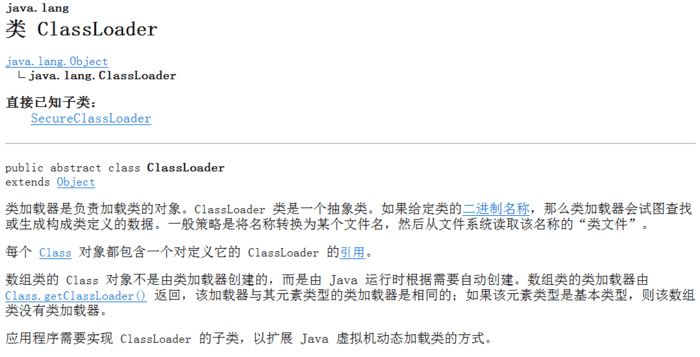 从文档中对ClassLoader类的介绍可以总结出这个类的作用就是根据一个指定的类的全限定名,找到对应的Class字节码文件,然后加载它转化成一个java.lang.Class类的一个实例.