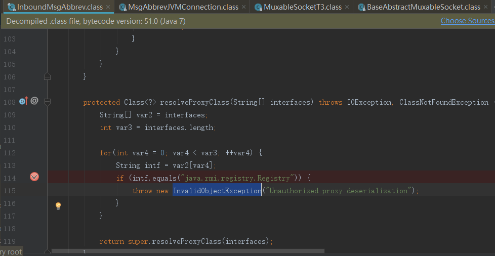 这个洞产生原因是weblogic对于T3协议发送的数据包没有过滤,注册一个RMI接口,通过T3协议建立连接,加载回来再一步步解包,利用readObject解析,从而造成反序列化远程代码执行。当然weblogic因为CVE-2017-3248对rmi接口做一个限制,在InboundMsgAbbrev类中,多了一个resolveProxyClass,对RMI接口类型进行了判断,对于是java.rmi.registry.Registry接口注册的,会抛出InvalidObjectException错误。(ps:在测试中发现10.3.6.0版本默认没有这个判断,所以在没有打CVE-2017-3248 patch的情况下可以直接打)