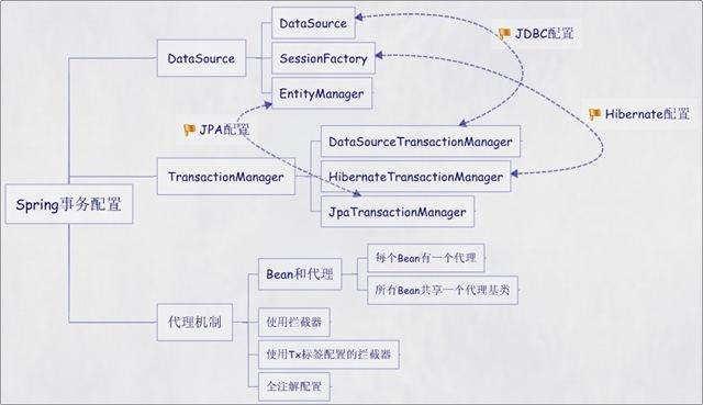Spring配置文件中关于事务配置总是由三个组成部分,分别是DataSource、TransactionManager和代理机制这三部分,无论哪种配置方式,一般变化的只是代理机制这部分。