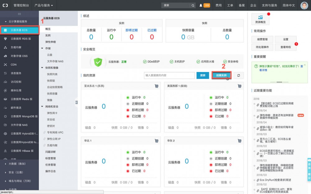 之前说过,我们选择阿里云作为云提供商。注册步骤就不展开了,大家可以到阿里云官网进行注册。注册完账号并成功登陆 控制台 ,点击左侧导航菜单 云服务器 ECS ,再点击 创建实例 按钮,如下图所示:
