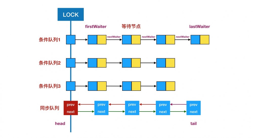 ConditionObject 是通过基于 单链表的条件队列 来管理等待线程的。线程在调用 await 方法进行等待时,会释放同步状态。同时线程将会被封装到一个等待节点中,并将节点置入条件队列尾部进行等待。当有线程在获取独占锁的情况下调用 signal 或 singalAll 方法时,队列中的等待线程将会被唤醒,重新竞争锁。另外,需要说明的是,一个锁对象可同时创建多个 ConditionObject 对象,这意味着多个竞争同一独占锁的线程可在不同的条件队列中进行等待。在唤醒时,可唤醒指定条件队列中的线程。其大致示意图如下: