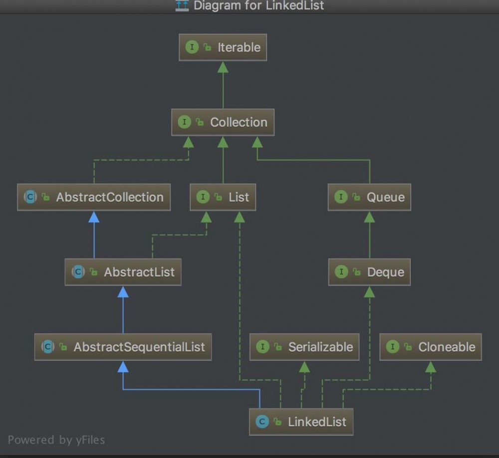 eng~从上述实现接口来看,LinkedList 与 ArrayList 之间在整体上面的区别在于, LinkedList 实现了 Collection 大家庭中的Queue(Deque)接口,拥有作为双端队列的功能 。(就好比一个小孩子,他不仅仅有父母的特性,他们有些人还会有舅舅的一些特性,好比 外甥长得像舅舅一般)。