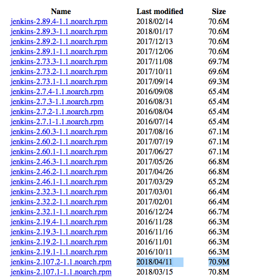 Jenkins提供可以独立安装运行的RPM包,从 这里 下载。我在这个页面下载的时候发现一个问题,rpm包并不完全是按照时间排序的,希望官方能够解决这个问题。