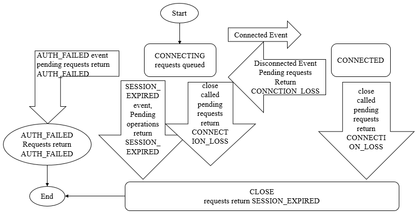 一旦客户端开始创建Zookeeper对象,那么客户端状态就会变成CONNECTING状态,同时客户端开始尝试连接服务端,连接成功后,客户端状态变为CONNECTED,通常情况下,由于断网或其他原因,客户端与服务端之间会出现断开情况,一旦碰到这种情况, Zookeeper客户端会自动进行重连服务,同时客户端状态再次变成CONNCTING,直到重新连上服务端后,状态又变为CONNECTED ,在通常情况下,客户端的状态总是介于CONNECTING和CONNECTED之间。但是,如果出现诸如会话超时、权限检查或是客户端主动退出程序等情况,客户端的状态就会直接变更为CLOSE状态。