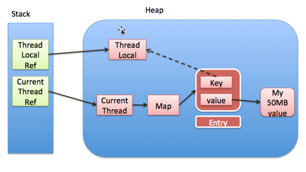 注意上图中的实线表示强引用,虚线表示弱引用。如图所示,每个线程实例中可以通过threadLocals获取到threadLocalMap,而threadLocalMap实际上就是一个以threadLocal实例为key,任意对象为value的Entry数组。当我们为threadLocal变量赋值,实际上就是以当前threadLocal实例为key,值为value的Entry往这个threadLocalMap中存放。需要注意的是**Entry中的key是弱引用,当threadLocal外部强引用被置为null( threadLocalInstance=null ),那么系统 GC 的时候,根据可达性分析,这个threadLocal实例就没有任何一条链路能够引用到它,这个ThreadLocal势必会被回收,这样一来,ThreadLocalMap中就会出现key为null的Entry,就没有办法访问这些key为null的Entry的value,如果当前线程再迟迟不结束的话,这些key为null的Entry的value就会一直存在一条强引用链:Thread Ref -> Thread -> ThreaLocalMap -> Entry -> value永远无法回收,造成内存泄漏。**当然,如果当前thread运行结束,threadLocal,threadLocalMap,Entry没有引用链可达,在垃圾回收的时候都会被系统进行回收。在实际开发中,会使用线程池去维护线程的创建和复用,比如固定大小的线程池,线程为了复用是不会主动结束的,所以,threadLocal的内存泄漏问题,是应该值得我们思考和注意的问题,关于这个问题可以看这篇文章---- 详解threadLocal内存泄漏问题