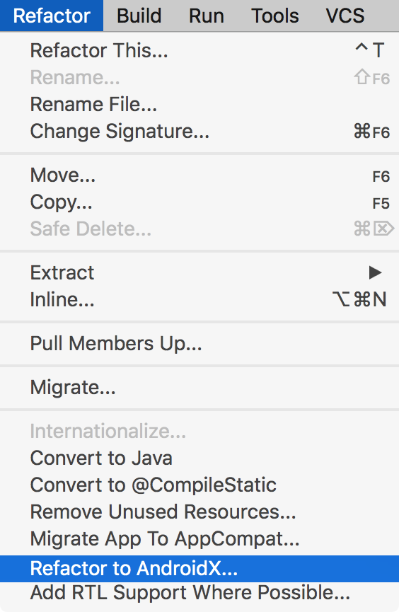 Source refactoring updates your Java code, XML resources, and Gradle configuration to reference the refactored classes and Maven artifacts. This feature is available in Android Studio Canary 14 for applications targeting Android P.
