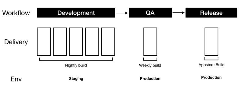 首先,我们开发。然后 QA 组的同事帮我们手工测试应用。QA 人员批准构建测试后,我们放出(提交到 AppStore 待审核)我们的应用。在不同的阶段中,我们有不同的环境。在开发期,我们创建的应用在一个测试环境中,以备平时测试。当 QA 组正在测试时,我们准备一个生产环境的应用,这可能是每周专门提供给 QA 测试用。最后,我们提交一个生产环境的应用。这样,最终构建可能没有一个明确的时间表。