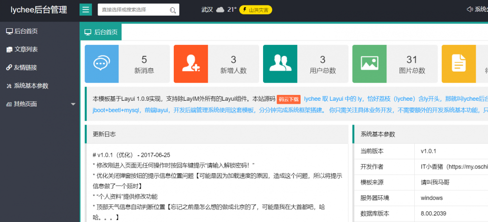 lychee 后端使用 Jboot+Beetl+MySQL,前端 Layui,开发后端管理系统使用这套模板,分分钟完成系统框架搭建。你只需关注具体业务开发,不需要额外的开发系统基本功能,只为开发更快,lychee 致力于敏捷开发。