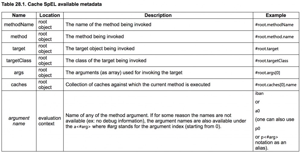 @Cacheable(value="books", key="#isbn" public Book findBook(ISBN isbn, boolean checkWarehouse, boolean includeUsed) @Cacheable(value="books", key="#isbn.rawNumber") public Book findBook(ISBN isbn, boolean checkWarehouse, boolean includeUsed) @Cacheable(value="books", key="T(someType).hash(#isbn)") public Book findBook(ISBN isbn, boolean checkWarehouse, boolean includeUsed)