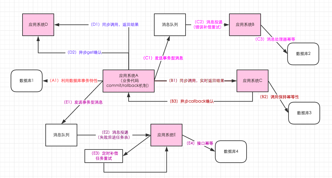 借助消息队列,在处理业务逻辑的地方,发送消息,业务逻辑处理成功后,提交消息,确保消息是发送成功的,之后消息队列投递来进行处理,如果成功,则结束,如果没有成功,则重试,直到成功,不过仅仅适用业务逻辑中,第一阶段成功,第二阶段必须成功的场景。对应上图中的C流程。