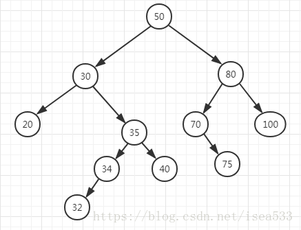 初始状态如下图所示,我们可以按照 50, 30, 80, 20, 35, 34, 32, 40, 70, 75, 100 的顺序插入到树中,就会产生下图所示的树。