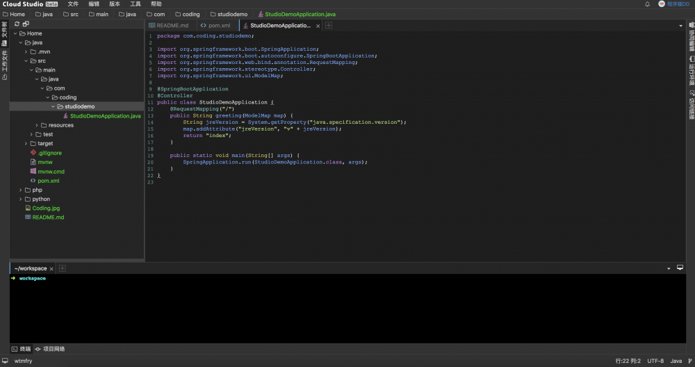其中包含了目前支持的三种语言工程:Java、Python以及PHP。同时图中,我展开了Java工程内容,大家可以看到Java工程就是一个简单的Spring Boot应用,用户可以直接在这个基础上编辑使用,也可以导入自己在Coding上托管的代码库来进行使用。