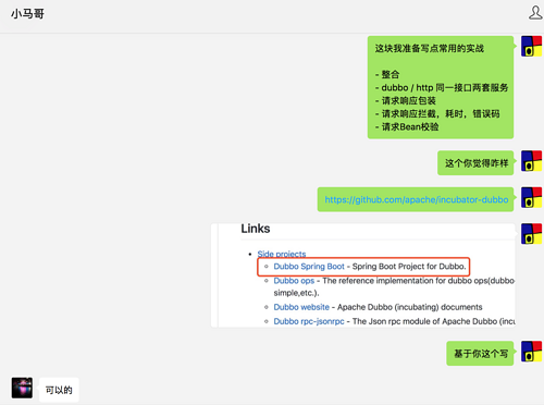 反正小马哥及阿里 Dubbo 团队做好了底层建筑,做好了更重基础组件。我这边的想法是做 side 周边开源项目,暂时不耻叫 dubbo-spring-boot-best-pratice