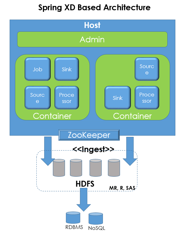 下图描述了基于 Spring XD 的架构。在下图这些模块的帮助下,我们可以创建、运行、部署并销毁数据管道,并对管道中的数据进行各种各样的处理。