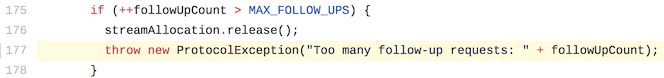 /** * How many redirects and auth challenges should we attempt? Chrome follows 21 redirects; Firefox, * curl, and wget follow 20; Safari follows 16; and HTTP/1.0 recommends 5. */ private static final int MAX_FOLLOW_UPS = 20;