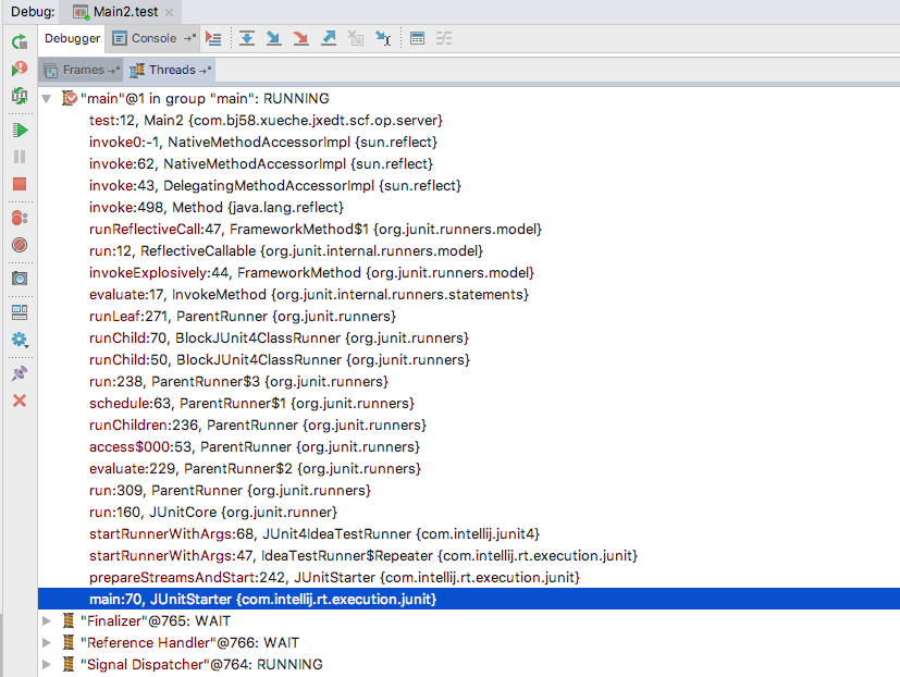 我想在这个类上打上断点试一下,走一遍,结果惊奇的发现,断点并没有走到这个,然后看了看 debug 窗中线程 main 发现有这么一个类 com.intellij.rt.execution.junit.JUnitStarter 最后 main() 原来是在这了类里的,这个类明显是 idea 内部的一个插件类。