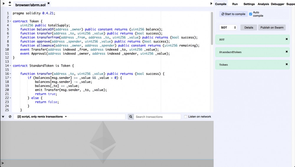 我们下面使用在线 IDE Remix 来编写我们的智能合约:简单的发行 31415926 个 SOT tokens,支持简单的合约转账功能。