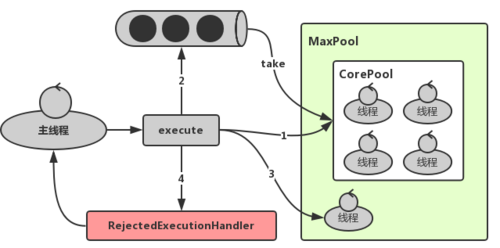 corePoolSize ,则创建新线程来执行; corePoolSize ,则将任务加入BlockingQueue; BlockingQueue (队列已满),则创建新的线程来处理任务; maximumPoolSize ,任务将被拒绝,并调用 handler.rejectedExecution(command, this) 方法。 ThreadPoolExecutor 采取上述步骤的总体设计思路,是为了在执行executor()方法时,尽可能地避免获取全局锁(那将会是一个严重的可伸缩瓶颈)。在 ThreadPoolExecutor 完成预热之后(当前运行的线程数大于等于 corePoolSize ),几乎所有的 execute() 方法调用都是执行步骤2,而步骤2不需要获取全局锁。