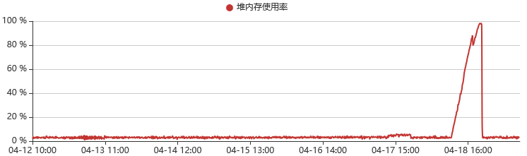 最近新版本发布后,在运行一段时间后程序突然无响应了,观察监控,发现JVM堆内存占用在某个时间点突然飙升,最终导致应用无响应: