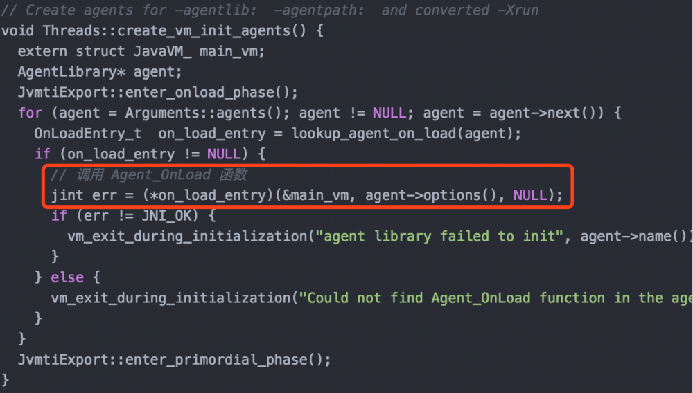 上面代码里一开始的 createNewJPLISAgent 和 on_load 是一样的注册了一些钩子函数,具体详情可参考: 《JVMTI Agent 工作原理及核心源码分析》 。