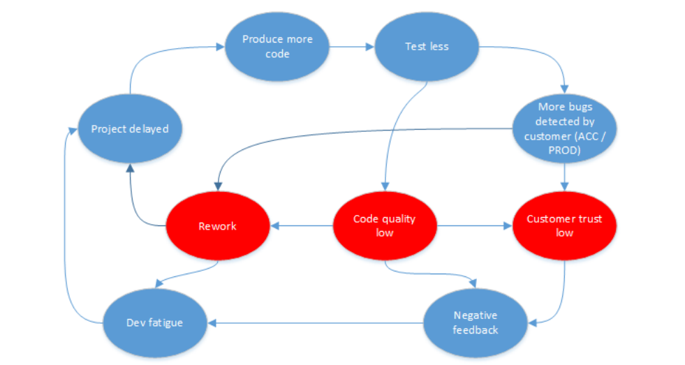 通常,当项目(因为某种原因)延期了,则容易陷入一种消极反馈循环。有时我们会先决定跳过编写测试代码,而这则会造成情况如下图所示: