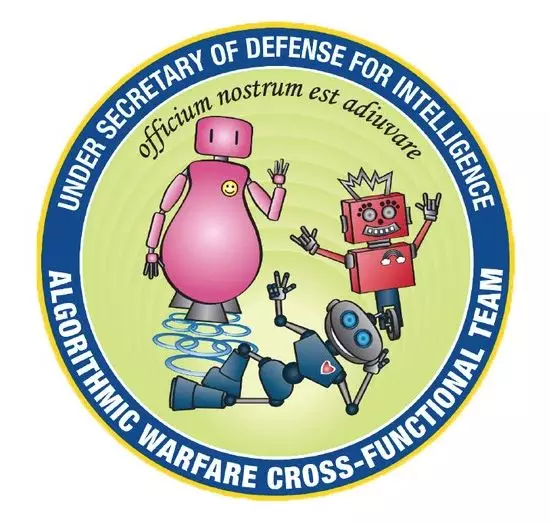 Maven 项目的正式名称是算法战争跨职能团队(Algorithmic Warfare Cross-Functional Team)。项目负责人 Jack Shanahan 中将在最近的一次展示中呈现了该团队的一枚图章,图章上画了三个快乐的卡通机器人,他们上方是一句 Google Translate 的拉丁语口号:「我们的工作是提供帮助」。