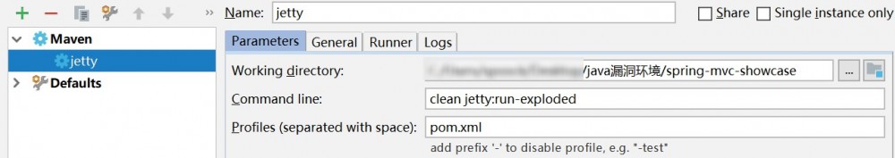 由于漏洞的环境要求是要求 jetty 服务器,我们需要通过 mvn jetty:run 这种方式启动,通过IDEA同样可以完成这样的功能。利用IDEA jetty插件就可以完成,具体的配置方法可以参考文章 idea jetty插件 。我的配置如下: