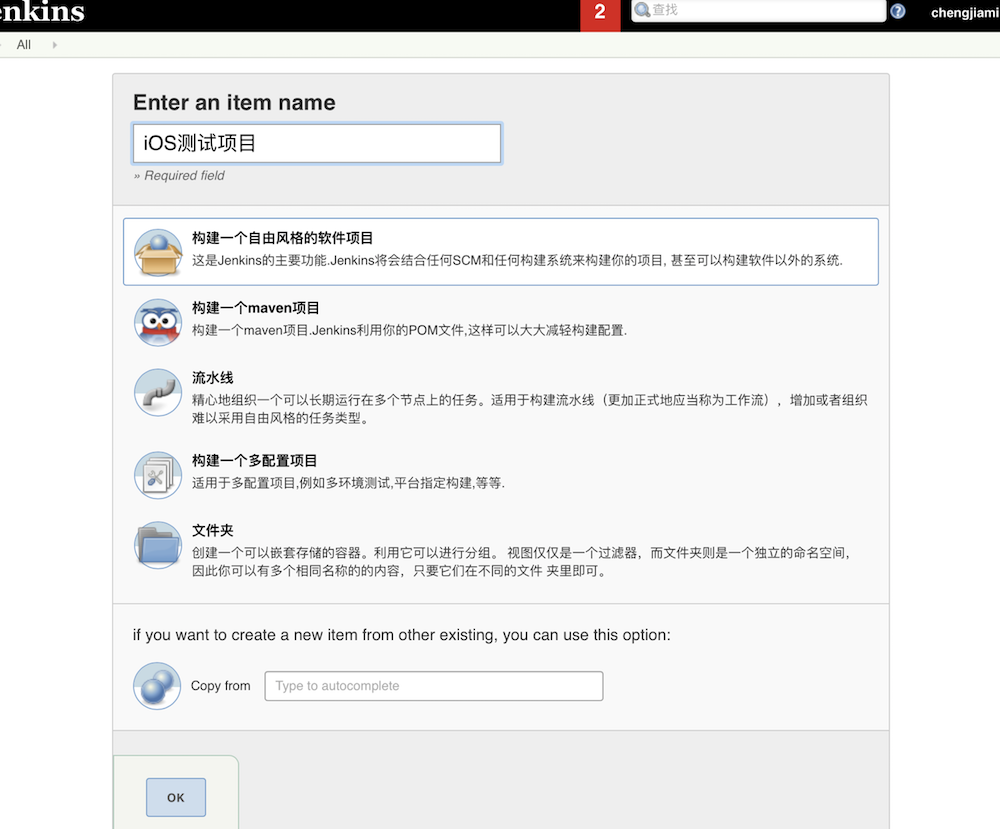 新建一个 iOS 的项目来开始自动化构建。点击“新建”,输入 item 名称,选择“构建一个自由风格的软件项目”,然后点击“OK”。