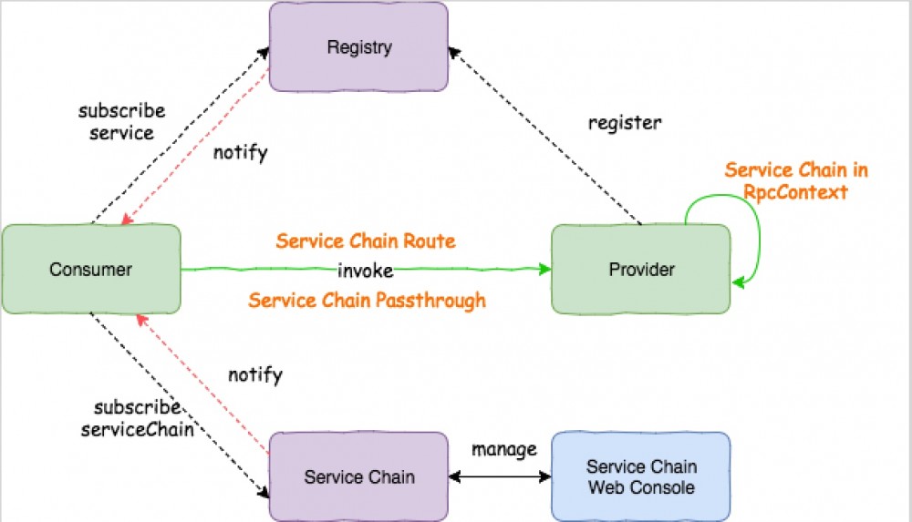 以 Dubbo 框架为例,给出了一个 Service Chain 实现架构图(下图来自有赞架构团队)