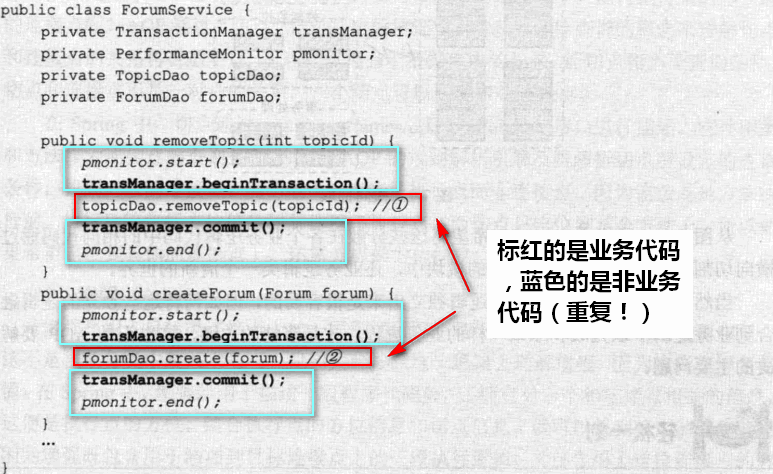 但是,我们现在的办法不行:即使抽取成类还是会出现重复的代码,因为这些逻辑(开始、结束、提交事务) 依附在我们业务类的方法逻辑中 !