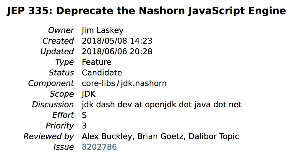还没有使用过 Nashorn ?如果感兴趣的话,建议尽快去尝试一下,因为 Jim Laskey 最近提交了一个新的 JEP 335 草案,准备弃用 Nashorn JavaScript 脚本引擎、API 以及该 jjs 工具。