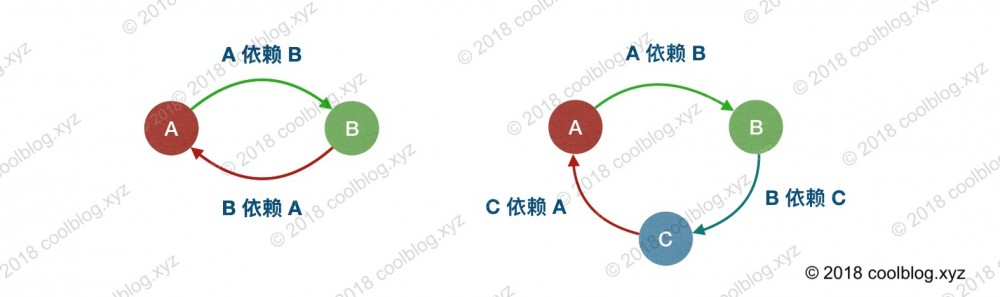 所谓的循环依赖是指,A 依赖 B,B 又依赖 A,它们之间形成了循环依赖。或者是 A 依赖 B,B 依赖 C,C 又依赖 A。它们之间的依赖关系如下: