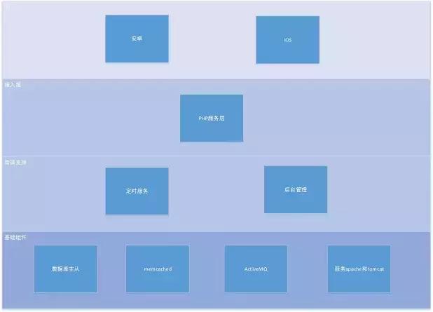 第一代系统最主要就是抢时间,公司希望用最短的时间内保证系统上线,那时候移动浪潮已经启动,于是决定优先上线移动端,网站可以暂不考虑。公司当时有PHP和Java两种开发语言技术储备,因为PHP在快速开发上面有着非常大的优势,因此决定采用前端PHP+后端Java这种模式。系统分成了三层:用户层:安卓和IOS移动端;接口层:php提供用户和交易接口;后端:后端有两部分,后台和定时系统。后台用PHP开发和接口层公用了一个系统,另一个是定时系统,负责计息、派息、到期等定时任务等使用了java开发。