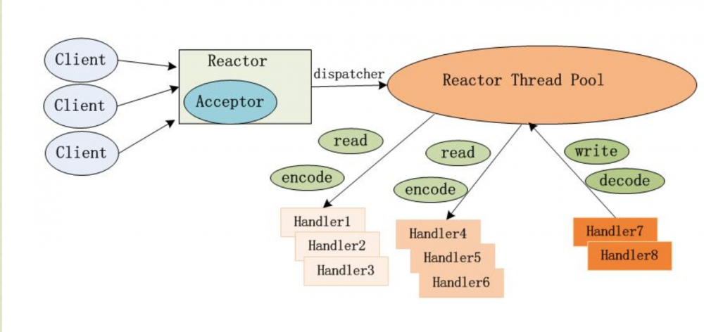 当一个新的连接连接到server端的时候,首先是acceptor接受到这个请求,然后将该请求派发给后面的线程池,然后线程池选择一个线程对数据进行一个解码,计算等处理.acceptor仅仅需要一个线程即可处理客户端的很多连接