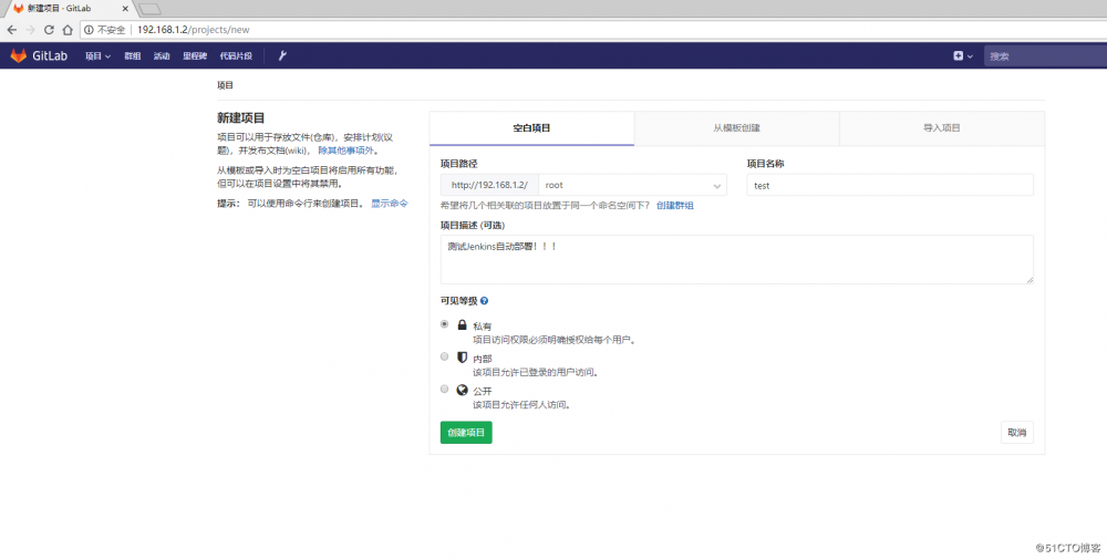 #克隆代码仓库,然后测试是否能够上传代码到gitlab git clone git@192.168.1.2:root/test.git cd test/ echo 11111 > 1.txt git add . git commit -m "add 1.txt" git push