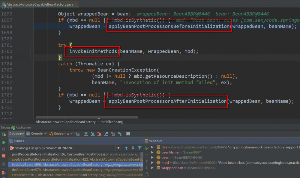 我们只需要在CustomBeanPostProcessor的postProcessBeforeInitialization和postProcessAfterInitialization方法里,打上两个断点,一切自然明了。