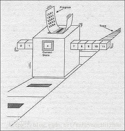 图灵机指一个抽象的机器,它有一条无限长的纸带,纸带分成了一个一个的小方格,每个方格有不同的颜色。有一个机器头在纸带上移来移去。机器头有一组内部状态,还有一些固定的程序。在每个时刻,机器头都要从当前纸带上读入一个方格信息,然后结合自己的内部状态查找程序表,根据程序输出信息到纸带方格上,并转换自己的内部状态,然后进行移动。