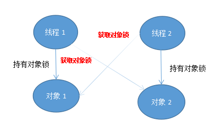 Thread1 持有:objOne 对象锁,等待获取:objTwo对象锁 Thread2 持有:objTwo 对象锁,等待获取:objOne对象锁