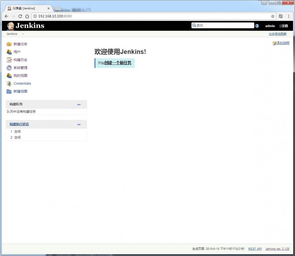 启动成功后,打开浏览器访问: http://192.168.10.100:8080 来到 Jenkins 初始化首页,按照提示设置即可,最终会看到如下界面:
