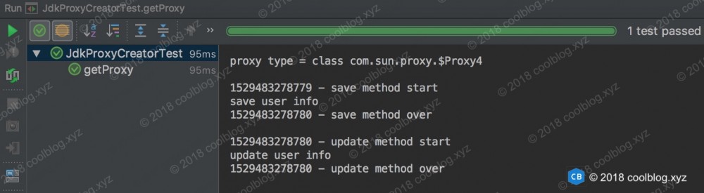 如上,从测试结果中。我们可以看出,我们的代理逻辑正常执行了。另外,注意一下 userService 指向对象的类型,并非是 xyz.coolblog.proxy.UserServiceImpl,而是 com.sun.proxy.$Proxy4。
