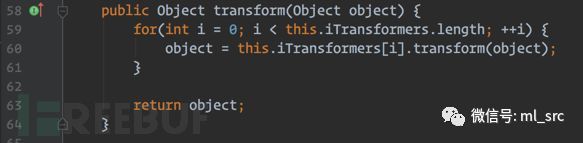 如果想要进行一系列的变换操作,可以通过定义一个 ChainedTransformer 来实现,只需要传入一个 Transformer 数组即可: